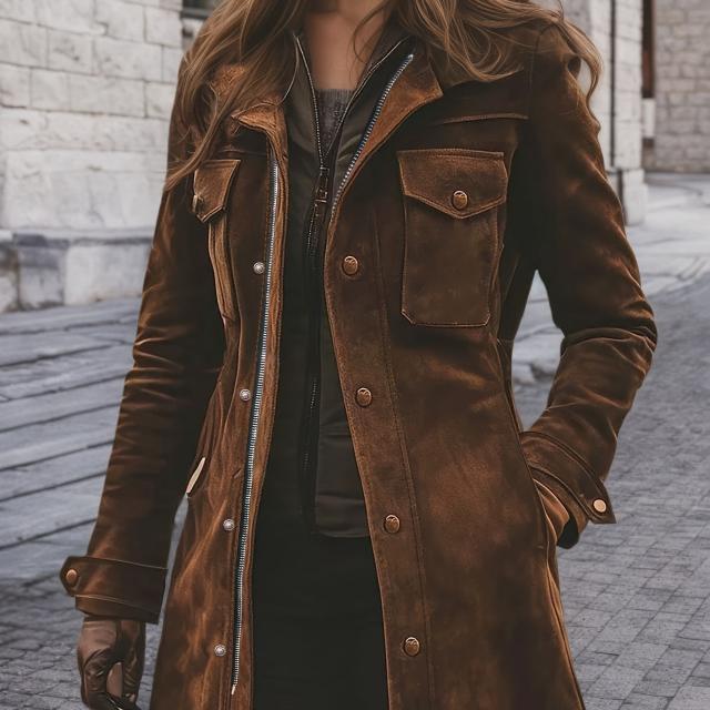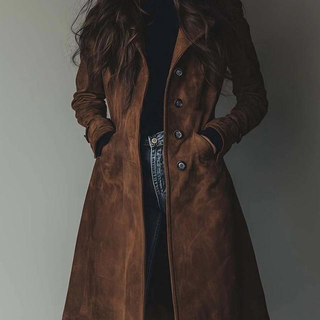 Elegant Suede Long Trench Women Coat Vintage Pocket Single Breasted