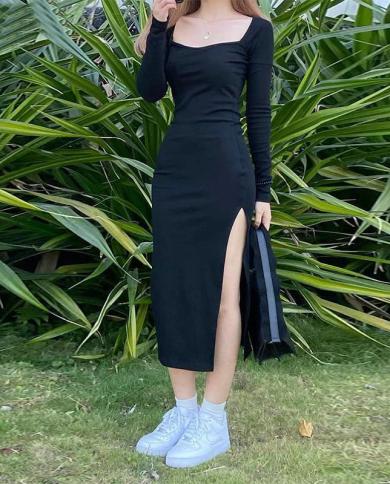 Women Long Sleeve Dress Midcalf Length Square Collar Black Sheath
