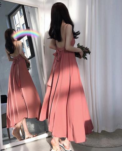 Women Summer Dress Spaghetti Strap Backless Back Belt Long