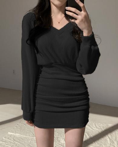High Waist Women Dress Vneck Solid Color Thin Elegant Bodycon
