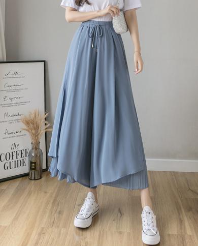 Casual Solid Color Wide Leg Pants Elastic Highwaist Pleated Womens