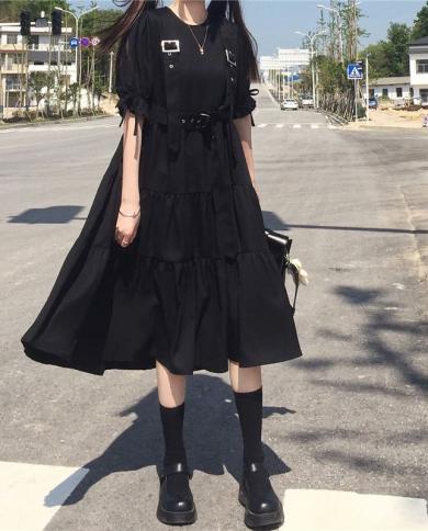 Women Black Midi Dress Harajuku Fashion Waist Suspenders Bandage