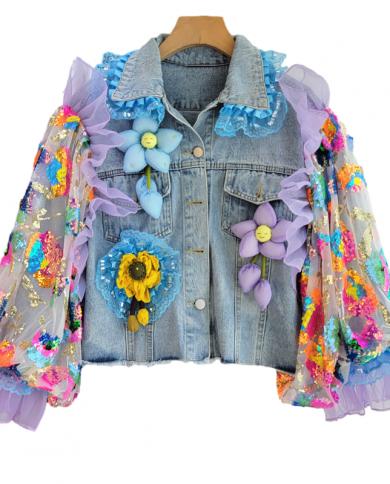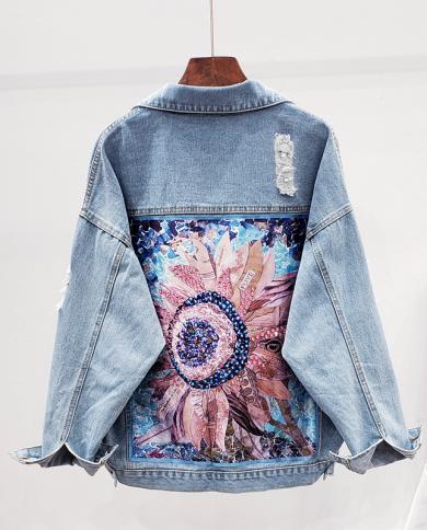 Boho Denim Jacket For Women Frayed Holes Sequin Floral Appliques