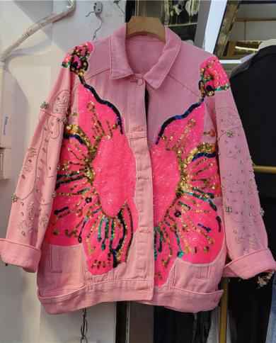 Heavy Work Beading Sequins Diamonds Denim Jacket Women Loose Pink