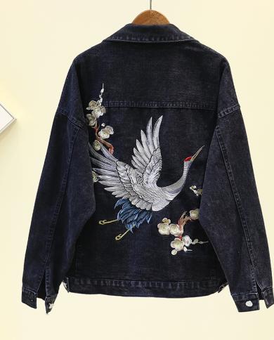 Fashion Black Blue Crane Embroidery Denim Jacket Coat Women
