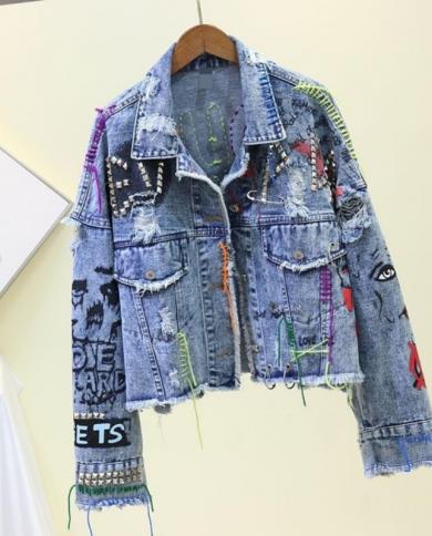 2023 Spring Autumn Women Street Fashion Graffiti Denim Jacket Female