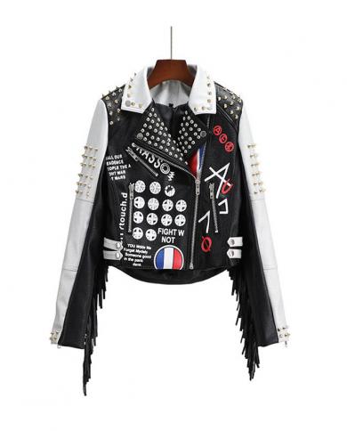 Map Tassels Punk Faux Leather Jacket Women Graffiti Studded