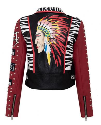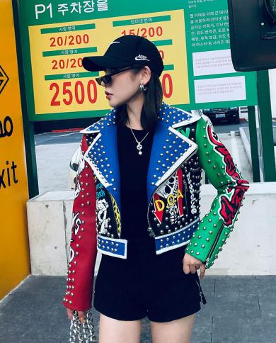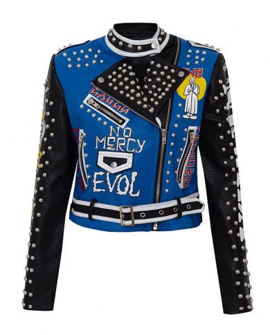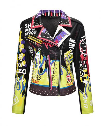 Spring Punk Faux Leather Jacket Women Graffiti Studded Rivet Fashion
