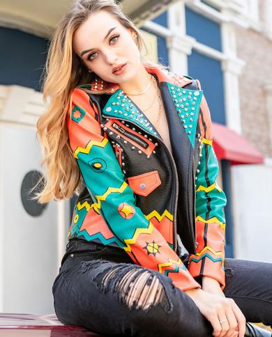 Women Punk Faux Leather Slim Jacket Indian Pattern Graffiti Studded