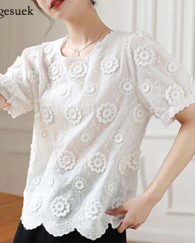 Summer Short Sleeve Vintage Woman Shirt Elegant Embroidered Flowers Lace
