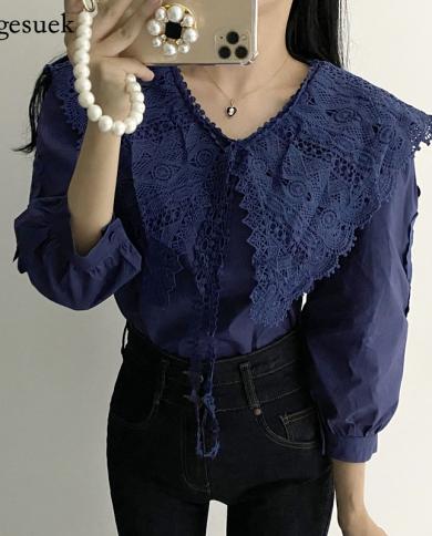 Vintage Lace Hollow Solid Shirt Women 2022 Summer Elegant Fashion
