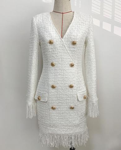 Trendy Brand Highquality Tweed White Woolen Coat Vneck Doublebreasted Midlength