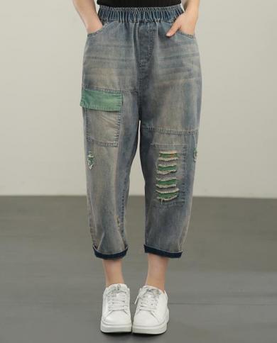 New Arrival Summer Women Hole Cotton Denim Patchwork Ankle