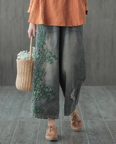 New Arrival Autumn Women Embroidery Cotton Denim Ankle Length