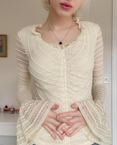 Tetyseysh Women Lace Tops Ruffle Shirt Solid Color Slim Fit