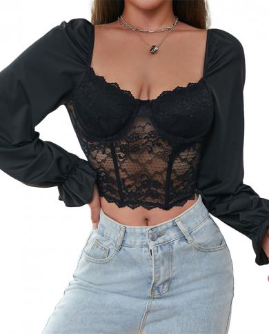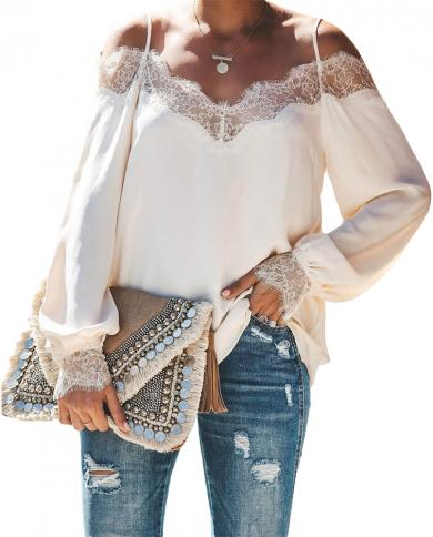 Tetyseysh Women Lace Chiffon Patchwork Top Long Sleeve Off Shoulder
