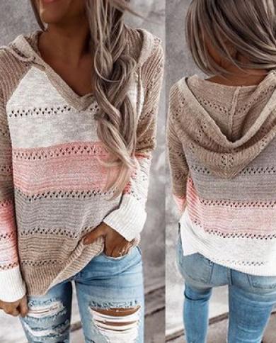 Women Casual Hoodie Sweatshirt Striped Color Block Long Sleeve Knitted