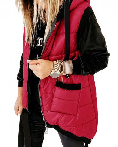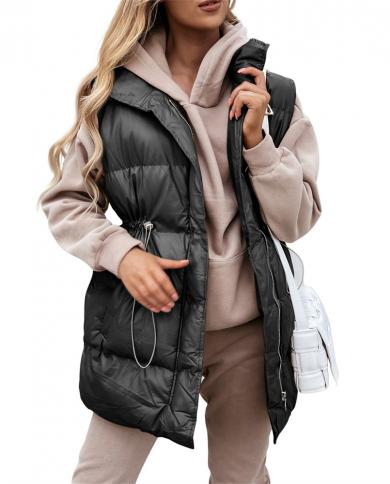 Women Drawstring Hooded Jacket Vest Fashion Solid Colour Zip Padded