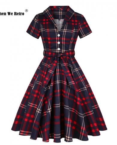Retro Women Short Sleeve S 4xl Cotton Vintage Plaid Dress