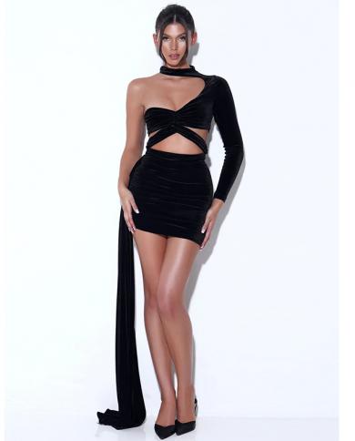 Womens Autumn Long Sleeve One Shoulder Velvet Double High Neck