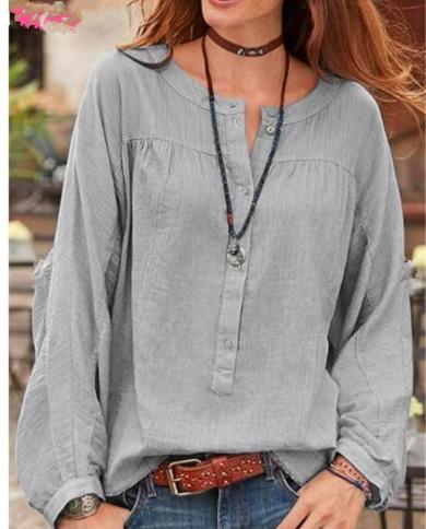 Womens Boho Solid Color Shirt Loose Long Sleeve Round Neck