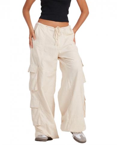 Women Baggy Cargo Pants Solid Color Loose Fit Drawstring Tie