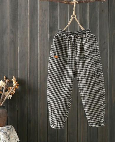 Summer Fashion Women Elastic Waist Harem Pants Cotton Linen Plaid