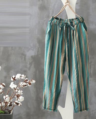 2022 Summer Fashion Women Pants Loose Casual Elastic Waist Striped
