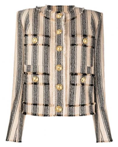 Women Jacket Sequin Striped Tweed Slim Fringe Round Neck Gold