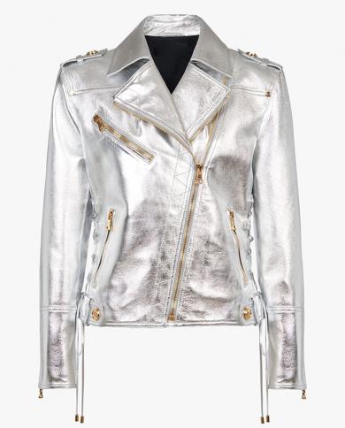 New Designer Silver Pu Leather Jacket Women Lacing Up Metallic