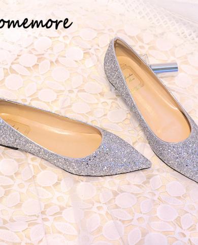 Comemore Fashion Elegant Silver Bling Glitter Flats Women Casual Pointed