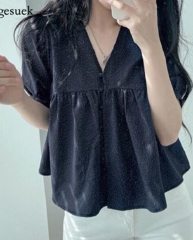 Summer New V Neck Bubble Sleeve Shirt Women Dot Loose