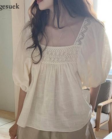 Chic Hollow Crochet Puff Sleeve Womens Shirt Summer Square