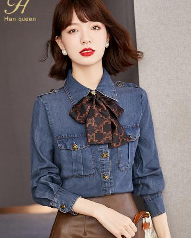 H Han Queen New Vintage Denim Shirts Office Lady Blouse