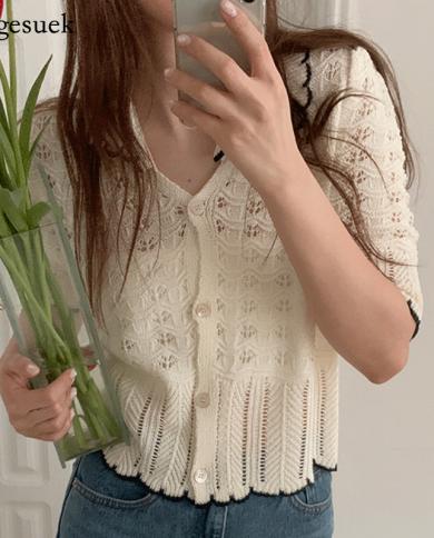 Chic Hollow Crochet Sweater Women Cardigans V Neck Short