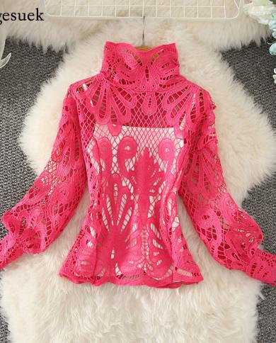 Spring Crochet Lace White Blouse Women Long Sleeve Blouses