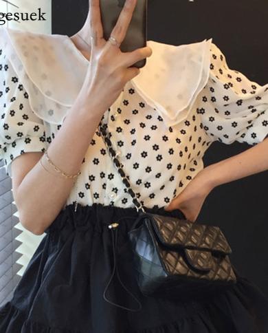 Chic Sweet Turn Down Collar Floral Women Blouses Summer Short