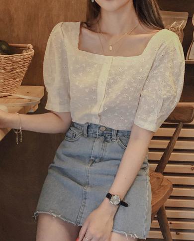 New Square Collar Embroidery Lace Shirt Tops Summer Hollow Casual