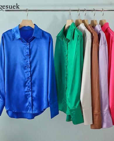 Casual Blue Green Satin Blouse Women Oversize Elegant Long Sleeve