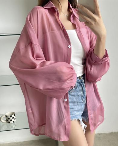 Fashion Loose Beach Sunscreen Shirt Women See Through Chiffon Blouse