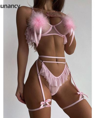 Yimunancy Ruched Plush Ball Lingerie Set Women 4 Piece Mesh