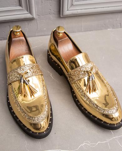 Golden Leather Shoes Fashion Mens Sequined Tassel Shoes Handmade