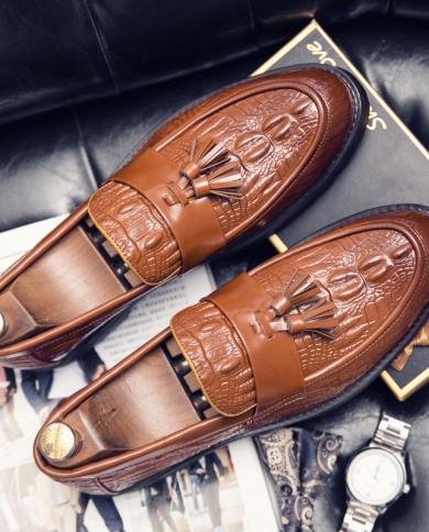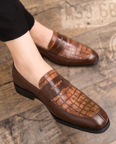 Men Brown Dress Loafers Crocodile Pattern High Quality Slip On