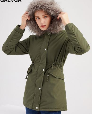 Gacvga New Winter Mid Long Women Coat Hooded Fur Collar