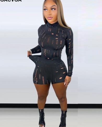 Gacvga Hollow Out 2two Piece Shorts Set Summer Long Sleeve
