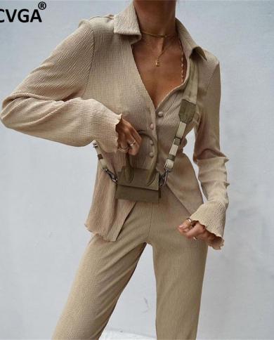 Gacvga Casual Solid Two Piece Sets Women Long Sleeve Buttons