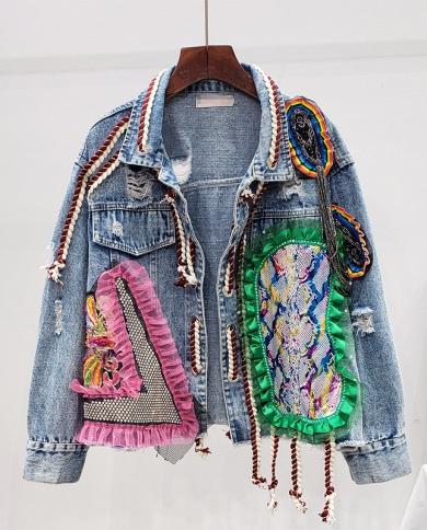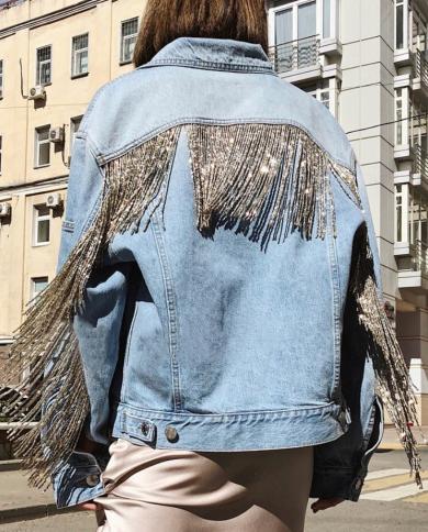 New Denim Jacket Womens Tassels Sequins Jeans Loose
