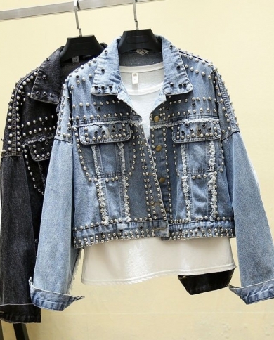 New Autumn Denim Jacket Women Rivet Handstudded Pearl Beading