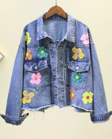 New Denim Jacket Women Coat Three Dimensional Flowers Pearl
