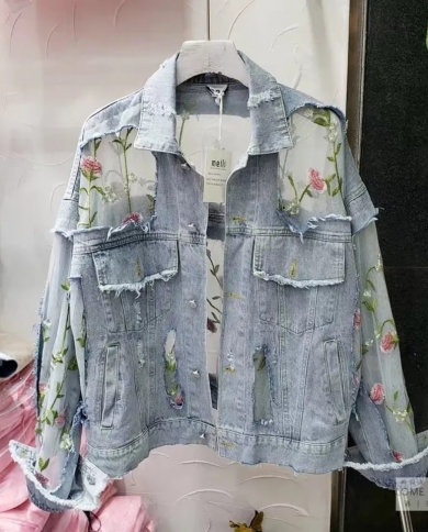 2022 New Women Denim Jacket Heavy Industry Embroidery Flower Mesh